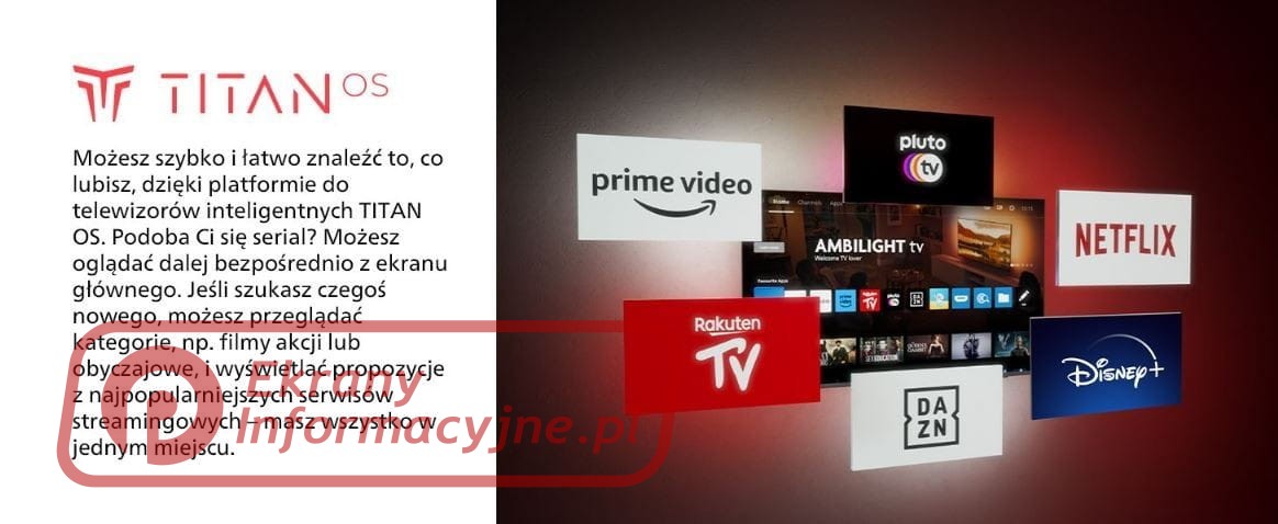Dzięki naszej inteligentnej platformie TV TITAN OS szybko i łatwo znajdziesz ulubiony program. Kochasz seriale? Możesz kontynuować oglądanie bezpośrednio z ekranu głównego. A jeśli szukasz czegoś nowego, możesz przeglądać kategorie, np. filmy akcji lub dramaty, i wyświetlać rekomendacje z najlepszych usług strumieniowych wszystkie w jednym miejscu.