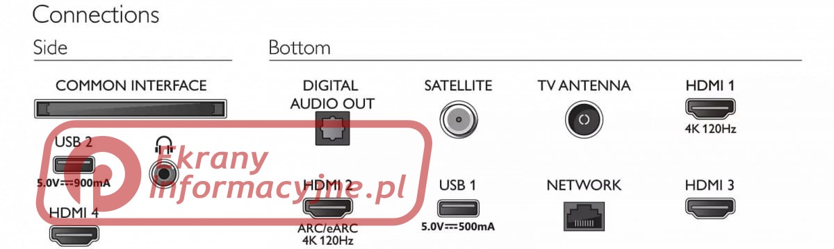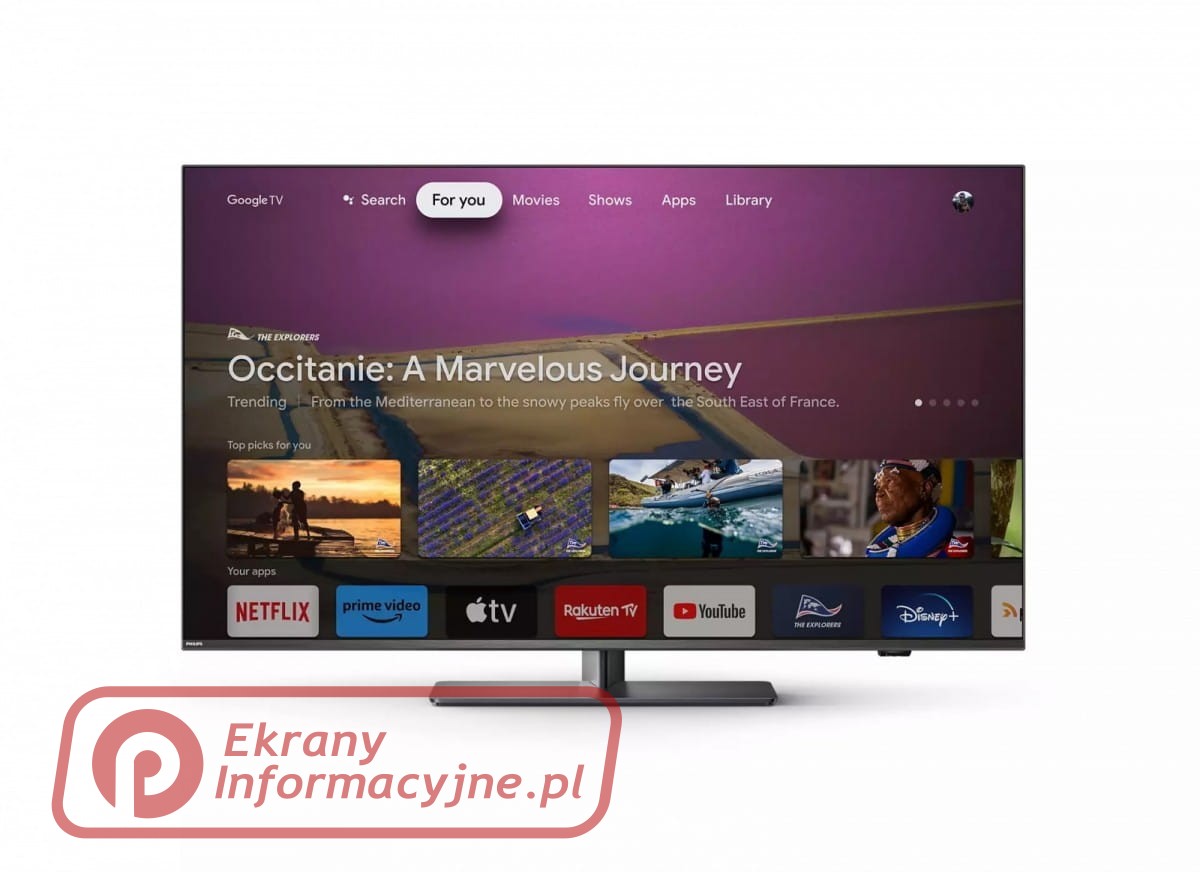 Funkcje specjalne: HbbTV Wbudowana funkcja Asystent Google Współpraca z usługą Alexa Filmy z Google Play Wyszukiwanie Google YouTube Netflix Apple TV Filmy Amazon Prime Disney+ Aplikacja Fitness Muzyka YouTube Ambilight Aurora