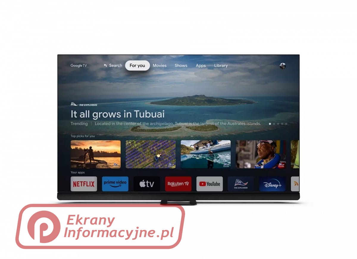 Praktycznie bezramkowy ekran tego atrakcyjnego telewizora OLED+ i niewielka metalowa podstawka sprawiają, że łatwo go ustawić. Opakowanie składa się z kartonu i papieru z recyklingu. Smukły pilot wyposażony jest w podświetlenie aktywowane ruchem i ładuje się za pośrednictwem złącza USB-C.