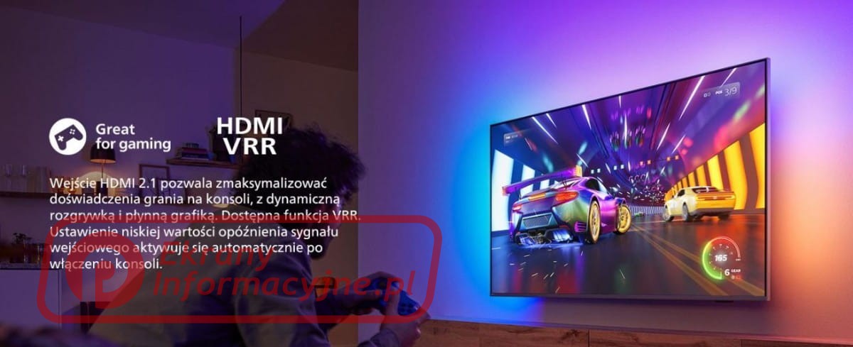 Złącze HDMI 2.1 pozwala w pełni korzystać z możliwości konsoli dzięki szybkiej rozgrywce i płynnej grafice. Urządzenie obsługuje technologię VRR, ustawienie małego opóźnienia aktywuje się automatycznie po włączeniu konsoli. Tryb gry systemu Ambilight sprawia, że emocje są jeszcze intensywniejsze.