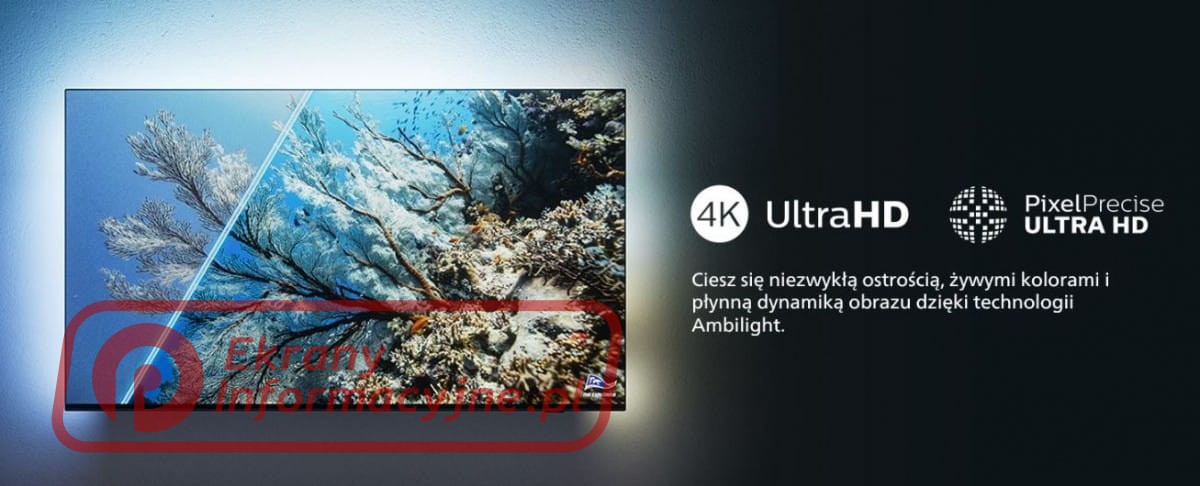 Telewizor LED 4K (UHD) z funkcją Ambilight pozwoli Ci czerpać wyjątkową radość z oglądanych programów. Silnik Philips Pixel Precise Ultra HD w telewizorze optymalizuje jakość obrazu, zapewniając, że jest niezwykle ostry, ma bogate kolory i płynny ruch. To gwarancja najlepszych możliwych wrażeń z oglądania.